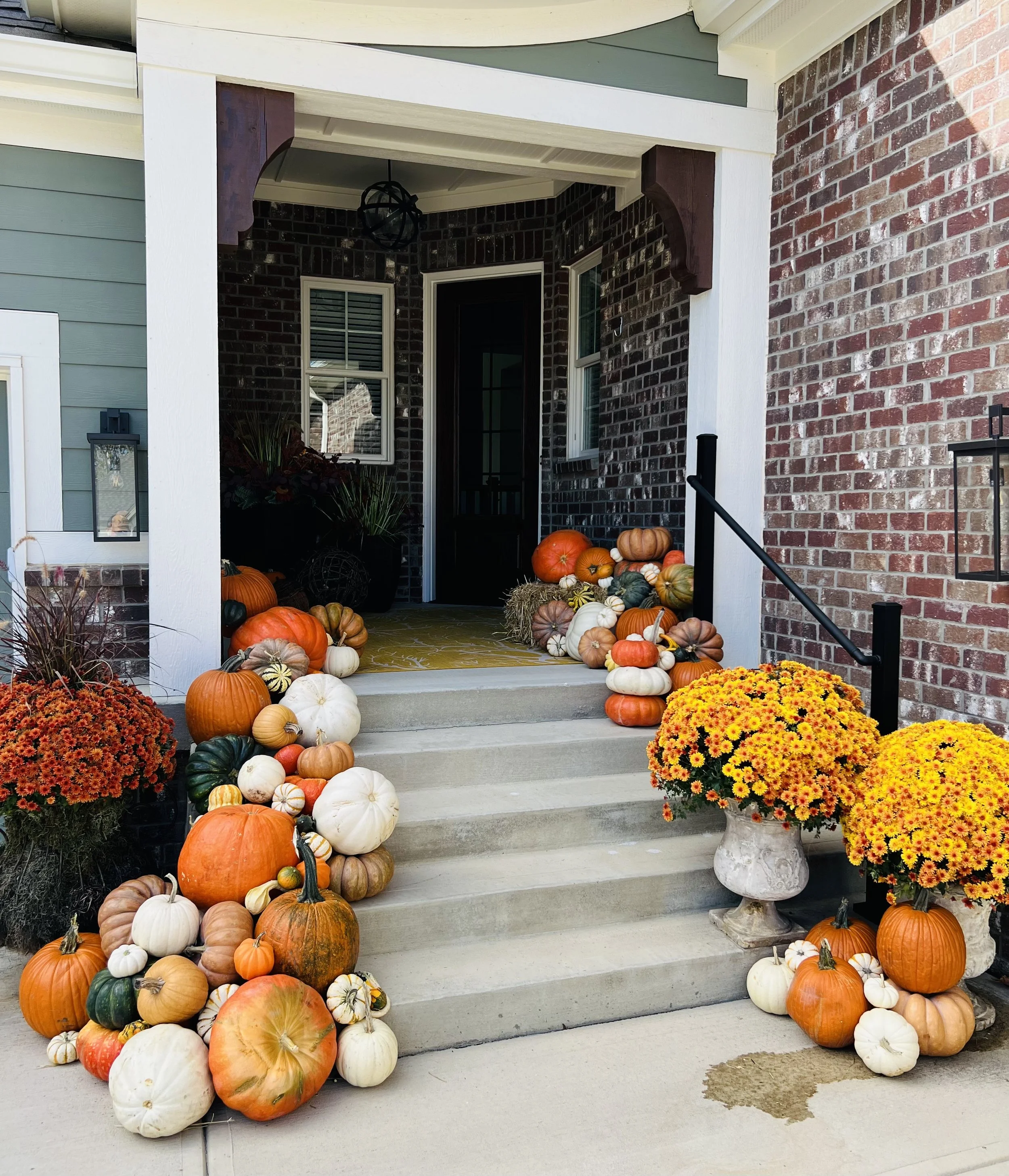Custom porch décor installations featuring pumpkins, gourds, and seasonal accents